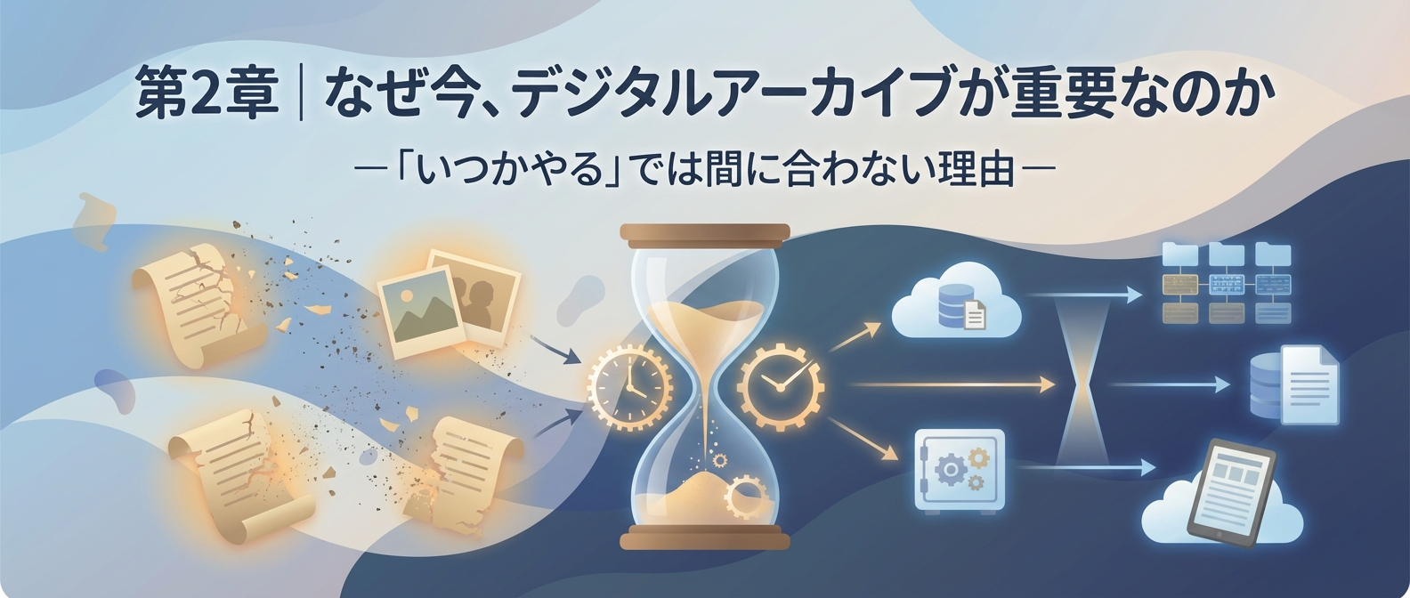 デジタルアーカイブは、「いつかやればいい」取り組みではありません。 後回しにするほど、失われる情報は増え、残せる範囲は狭まり、活用の可能性も減っていきます。