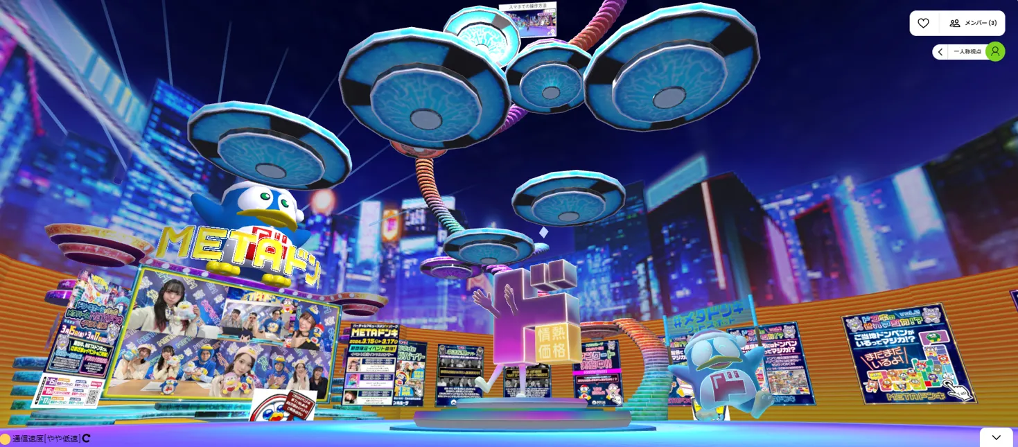 ドン・キホーテ(PPIHグループ)は、「METAドンキ」という仮想空間を公開しています。これは「旧DOOR(現Roomiq)」上に作られており、PC・スマートフォンからブラウザでアクセス可能な設計です。目的は、「近くに店舗がない」「店に行くのが難しい」人にもドン・キホーテのワクワク感を体験してもらうことです。