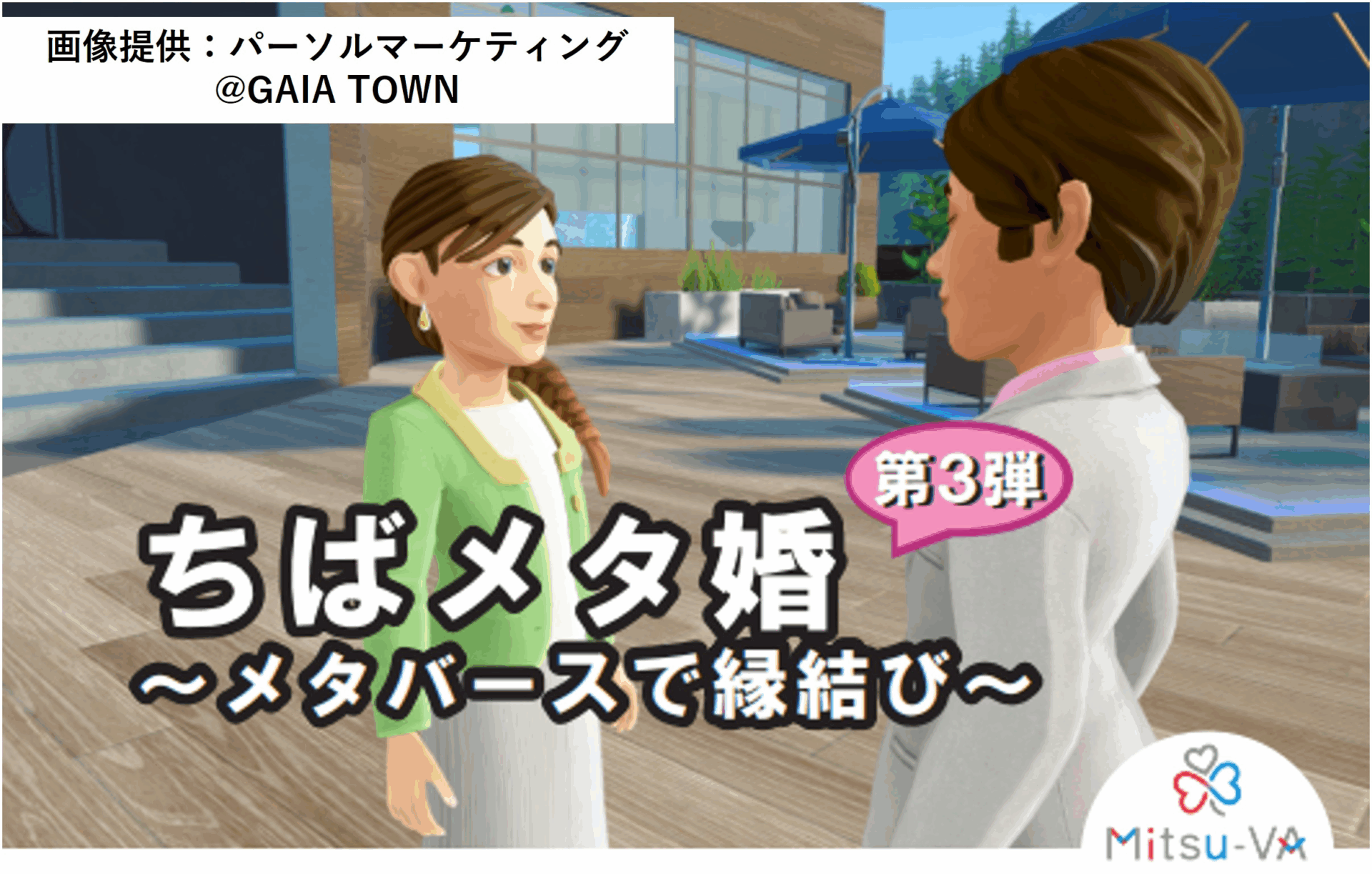 Mitsu-VAは、パーソルイノベーション株式会社が提供する、自治体連携型のメタバース婚活サービスです。アバターを活用した交流に加え、事前のパートナーシップ診断やデジタル仲人によるサポートなど、イベント運営を支援する仕組みが整えられています。