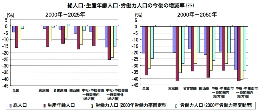 地方企業・自治体の採用活動は、少子高齢化や都市部への人口流出の影響を強く受けています。国土交通省の「地方における人口・労働力の変化」によると、2020年から2050年までに地方の労働人口は約40%減少すると予測されています。特に地方中小都市や中山間地域では急速な人口減少が進み、高齢化の影響により労働力人口の減少はその速度を上回る見通しです。