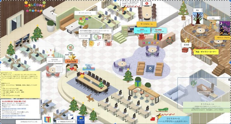 メタバースプラットフォームの「ovice」を活用して月曜〜金曜日の10時〜14時15分の間アクセスが可能となっており、その中で授業を行う形です。プログラミングや教育委員会が提供しているコンテンツでさまざまな学習を行うなど、子どもが興味を持ったことを学べる環境が整っています。