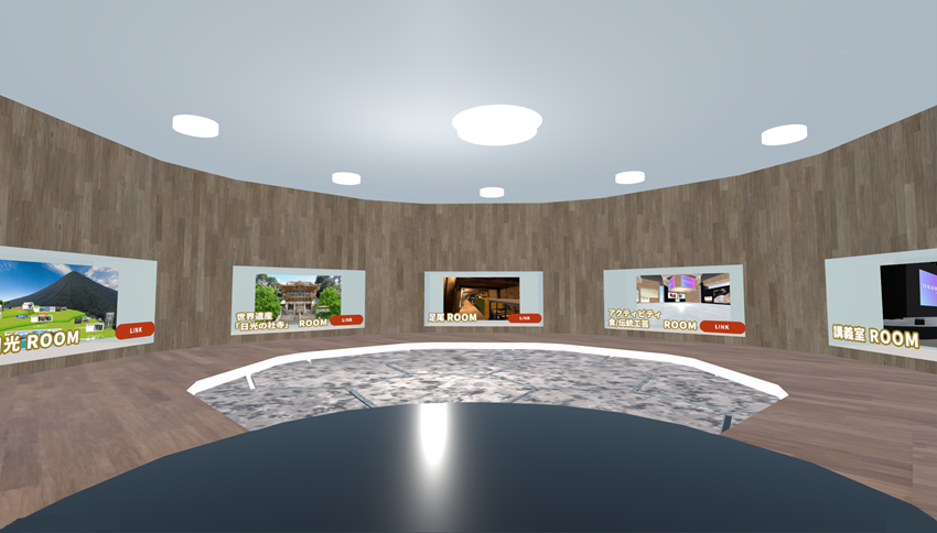 自然、文化遺産、食、伝統工芸など6つのテーマルームで構成され、児童・生徒がアバターを通じて学びながら探索できます。日光東照宮や戦場ヶ原など、実際の修学旅行地を体験的に学ぶことが可能です。