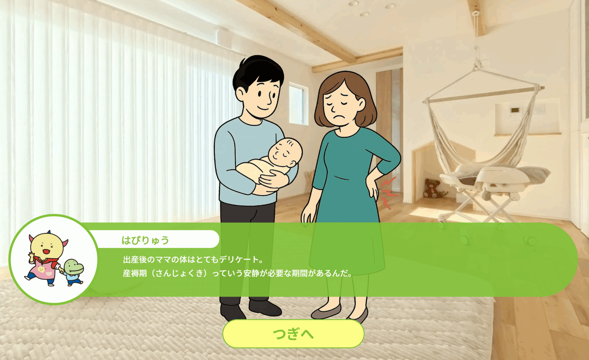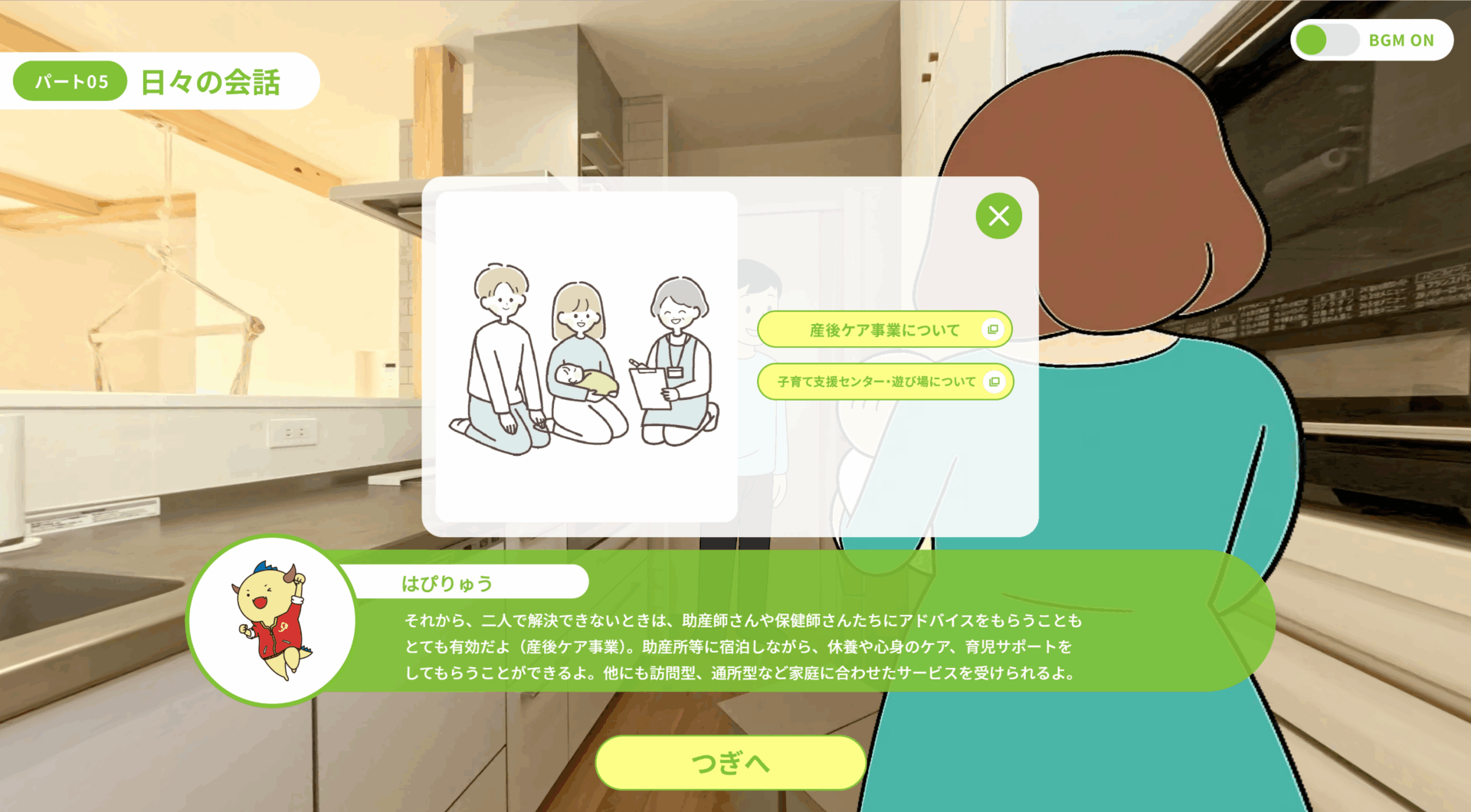 シーンは「育休スタート」から始まり、「産褥期を知る」「食事の工夫」「お風呂タイム」「日々の会話」「サポートの活用」など、育休期間に直面するテーマを網羅。ユーザーはボタン操作により、自分のペースで情報を取得しながら体験を進められる設計としました。